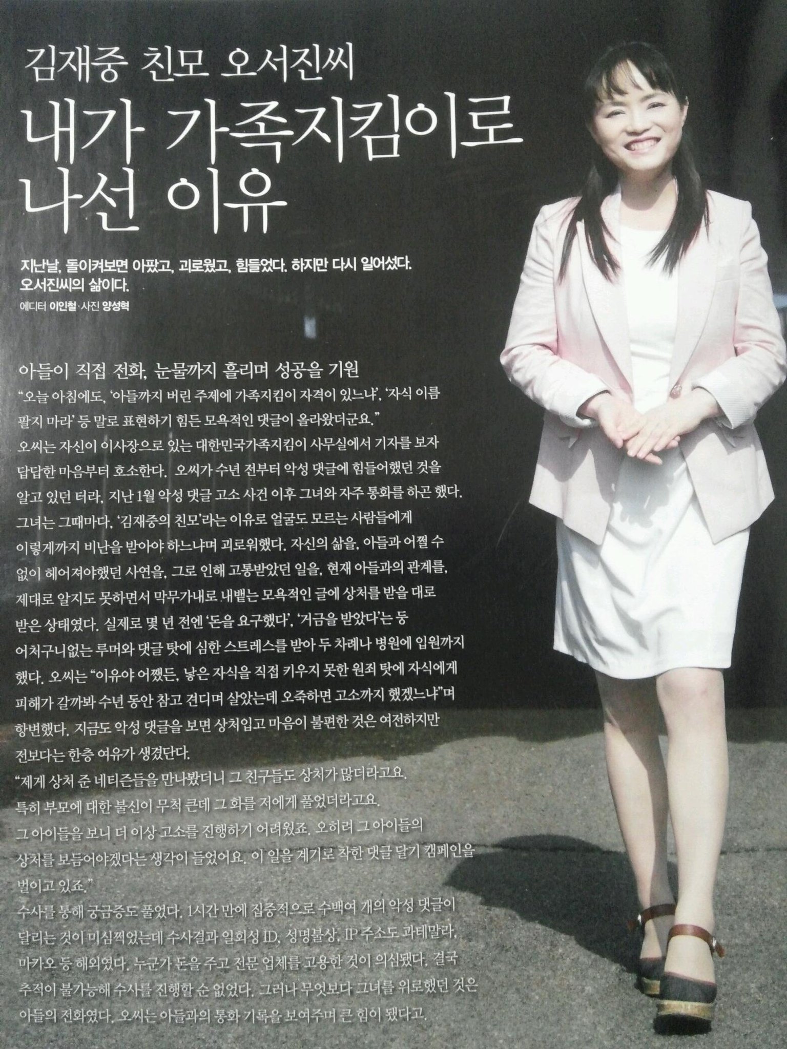 오서진 씨는 김재중이 유명해진 후에도 그를 그리워하며 힘든 시간을 보냈고, 결국 20여 년 만에 아들과 재회하게 되었습니다. 그녀는 현재 '대한민국 가족지킴이'의 이사장으로 활동하며, 자신의 경험을 바탕으로 다른 가족들에게 도움을 주고자 노력하고 있습니다. 김재중은 양부모에게도 큰 사랑을 받으며 성장했으며, 그들에게 효도하는 모습을 보여주고 있습니다.