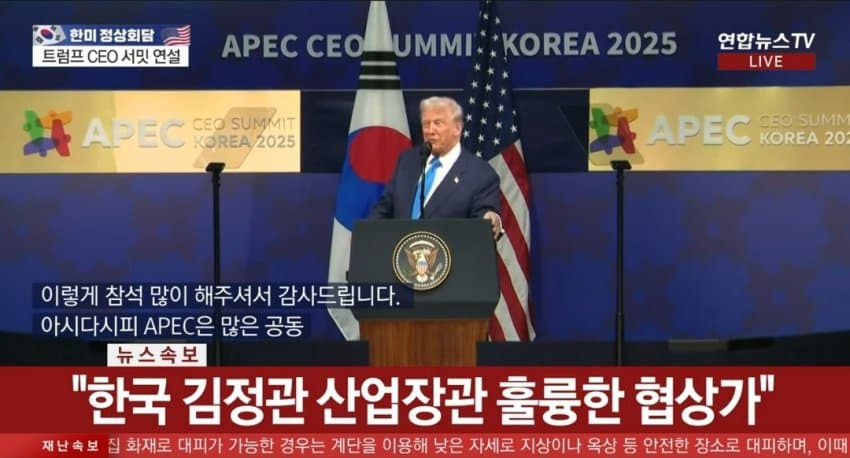 2025년 10월 29일 APEC CEO 서밋에서 트럼프 대통령은 김정관 장관을 지목하며 "그는 정말 대단한 분이자 아주 까다로운 협상가"라고 했습니다. 나아가 "조금 능력이 부족한 분을 만났으면 좋았을 걸"이라는 농담 섞인 표현까지 덧붙였습니다.