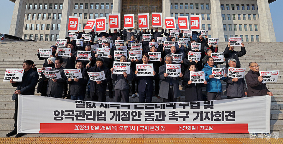 양곡관리법 개정안은 초과 생산된 쌀을 정부가 의무적으로 매입하도록 하고, 시장가격이 일정 기준 이하로 하락할 경우 차액을 보전하는 양곡가격안정제를 도입하는 것을 주요 골자로 합니다.