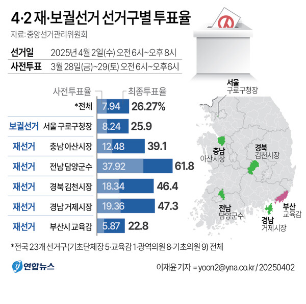 이번 재보궐선거는 최종 투표율이 26.27%로 집계되며 역대 네 번째로 낮은 투표율을 기록했습니다. 사전투표율은 7.94%로 저조했으며, 이는 탄핵 정국과 대형 산불 등으로 인해 유권자들의 관심이 분산된 결과로 보입니다. 지역별로는 전남 담양군이 가장 높은 투표율(61.8%)을 기록한 반면, 부산 교육감 선거는 가장 낮은 투표율(22.8%)을 보였습니다.